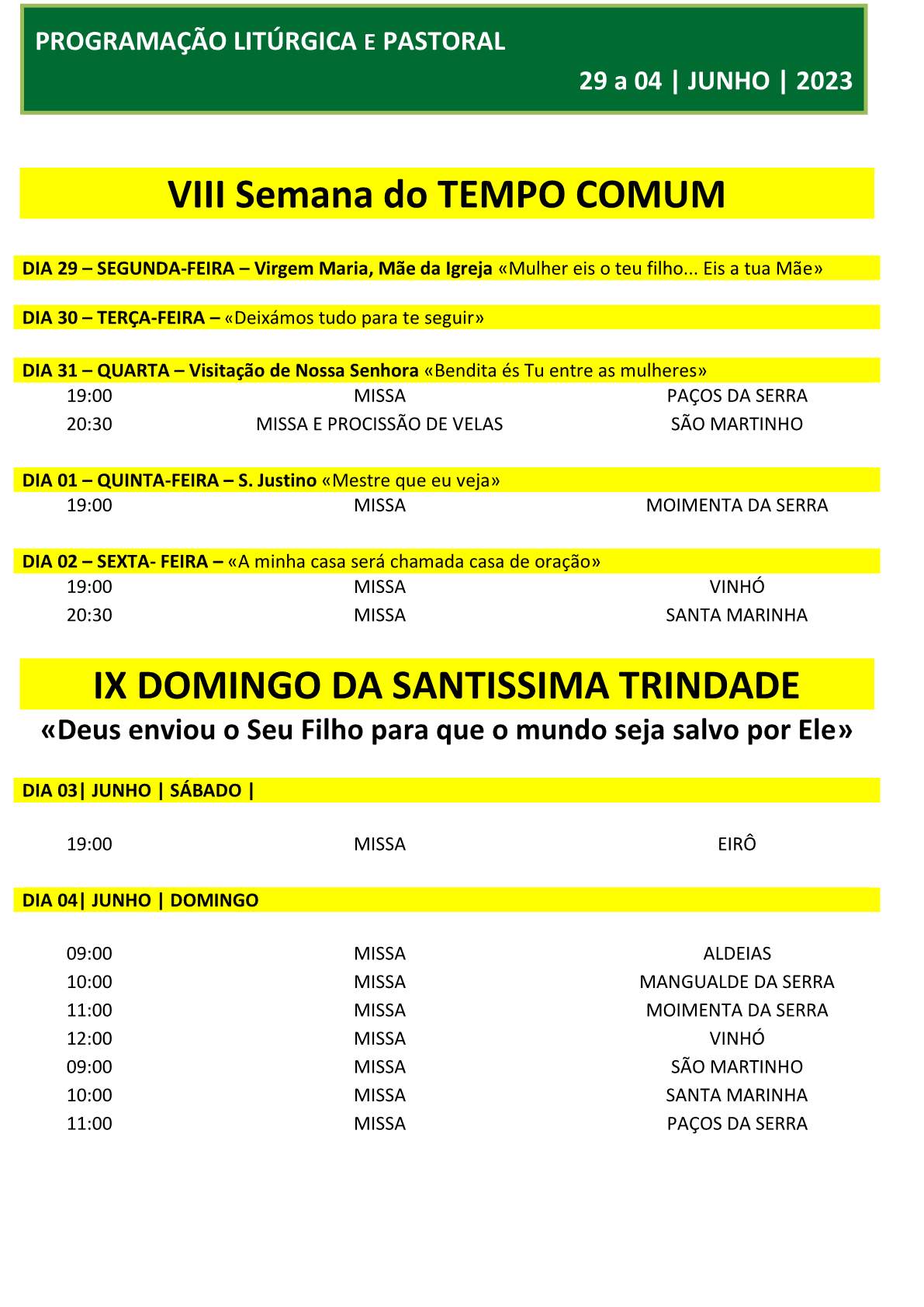Agenda 29 a 04 | Junho 2023 Detalhes Categoria: Agenda Publicado em quarta, 31 maio 2023 23:44 Escrito por Paróquia de Santa Marinha Visualizações: 453 Anterior Seguinte