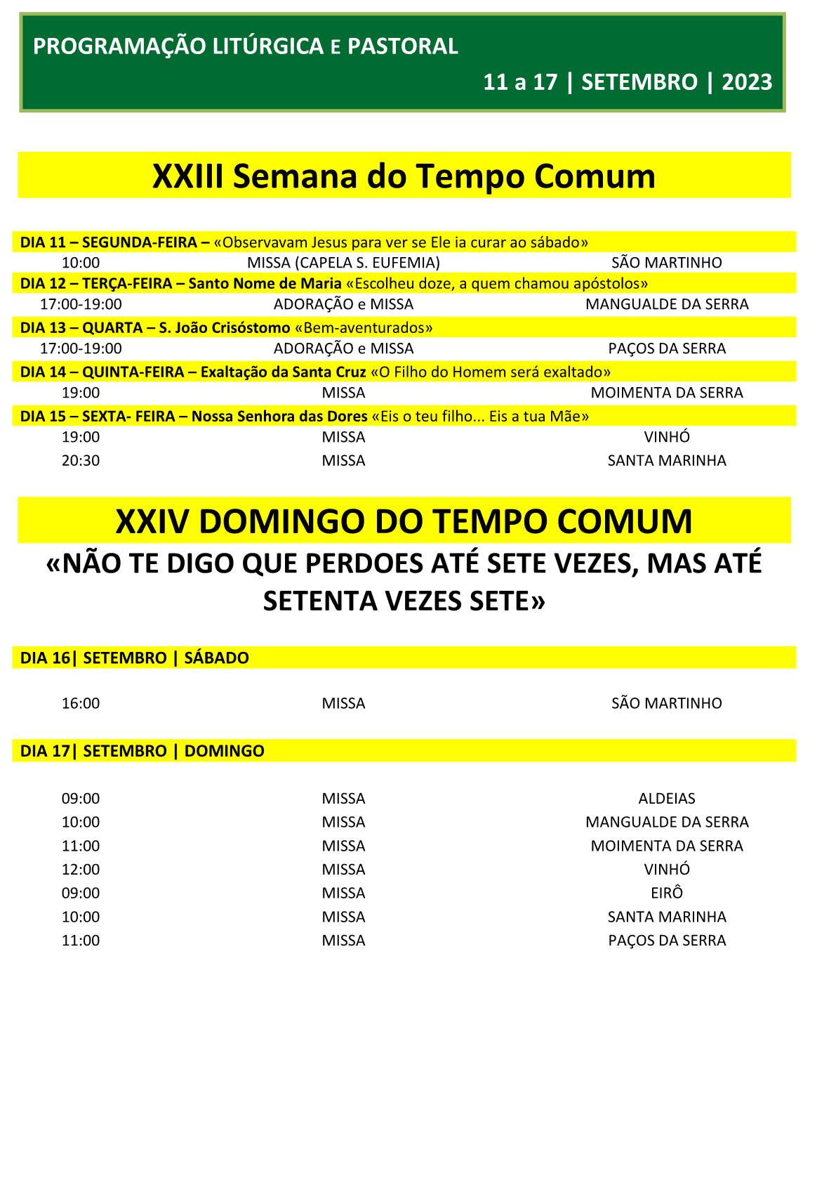 Agenda 11 a 17 | Setembro 2023 Detalhes Categoria: Agenda Publicado em terça, 12 setembro 2023 21:28 Escrito por Paróquia de Santa Marinha Visualizações: 402 Anterior Seguinte