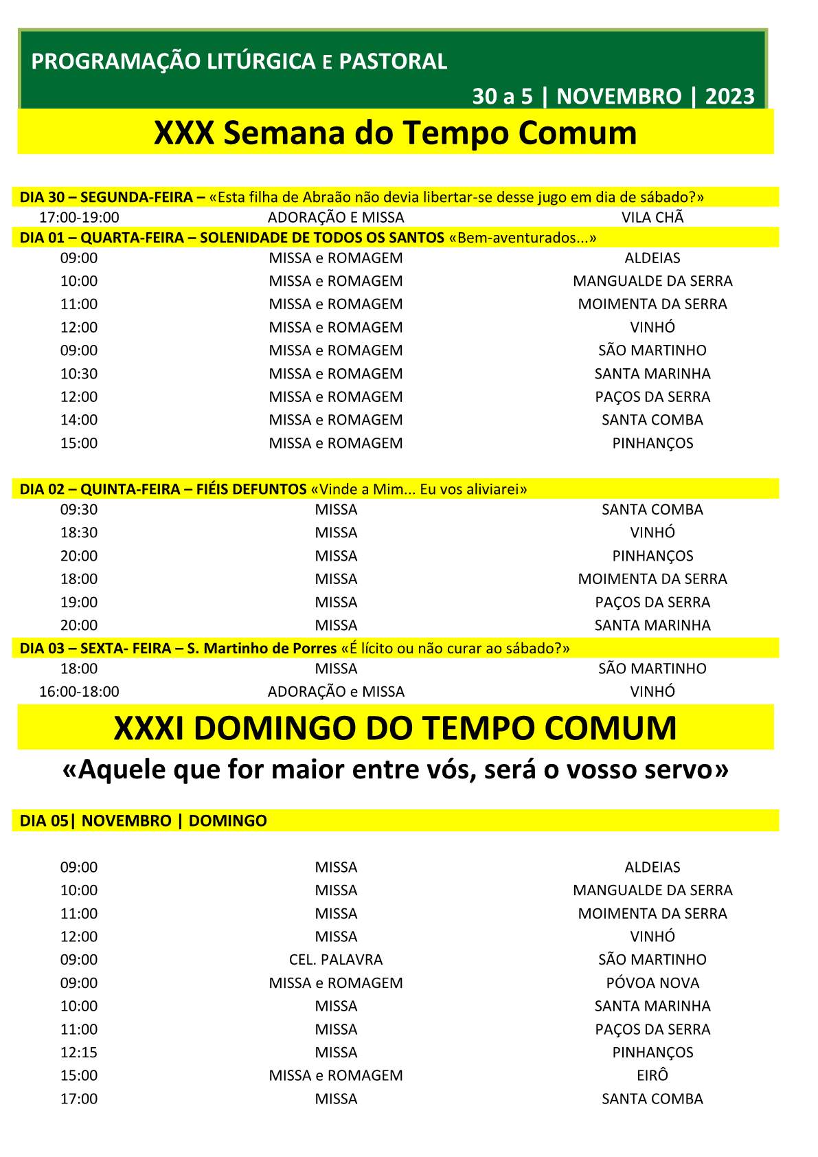 Agenda 30 a 05 | Novembro 2023 Detalhes Categoria: Agenda Publicado em segunda, 30 outubro 2023 19:09 Escrito por Paróquia de Santa Marinha Visualizações: 408 Anterior Seguinte