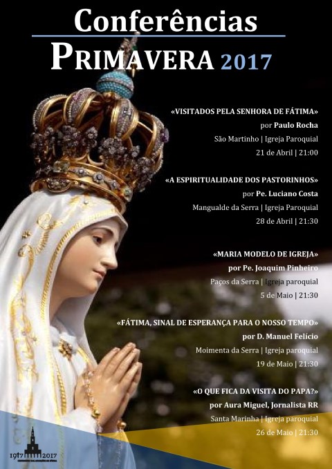O centenário das Aparições de Nossa Senhora em Fátima, 1917-2017, será o tema central das cinco conferências propostas que integram a terceira edição do Ciclo de Conferências de Primavera organizadas nas paróquias de São Martinho e Santa Marinha do arciprestado de Seia e Paços da Serra, Moimenta da Serra e Mangualde da Serra do arciprestado de Gouveia.