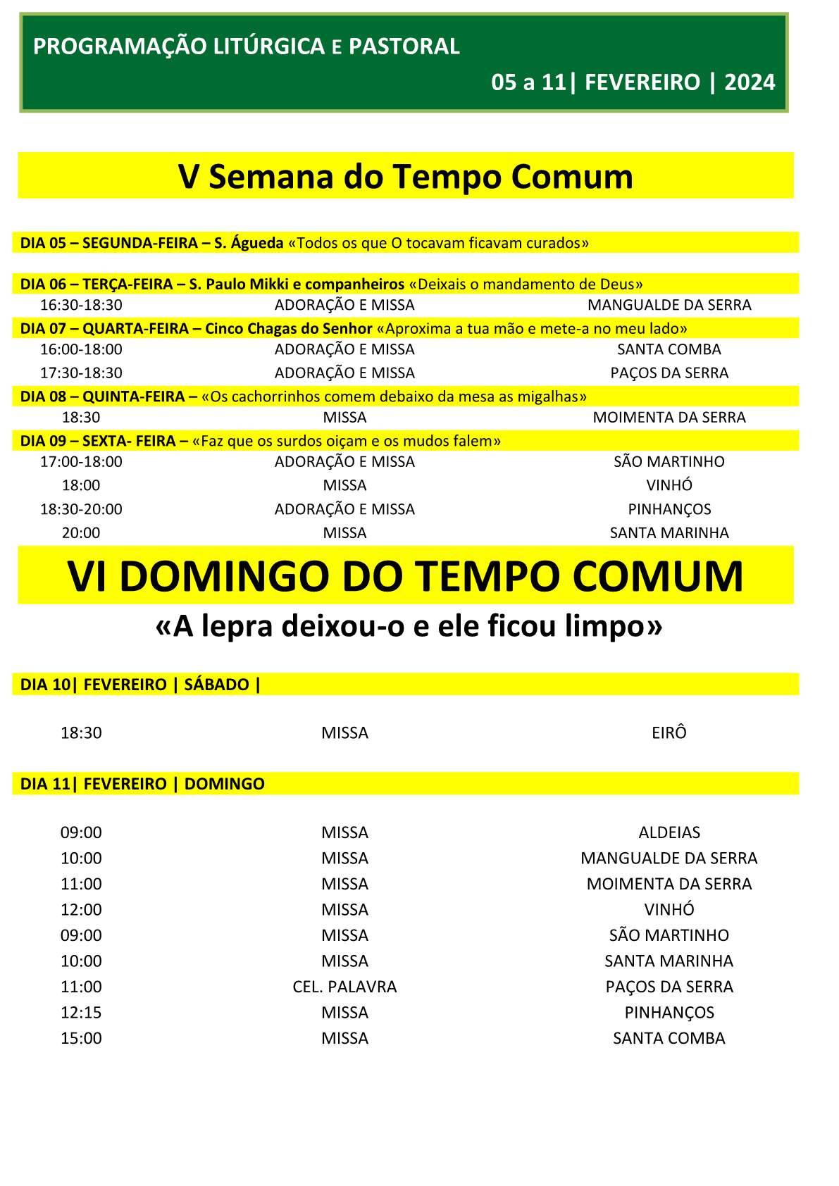 Agenda 05 a 11 | Fevereiro 2024 Detalhes Categoria: Agenda Publicado em segunda, 05 fevereiro 2024 21:36 Escrito por Paróquia de Santa Marinha Visualizações: 495 Anterior Seguinte