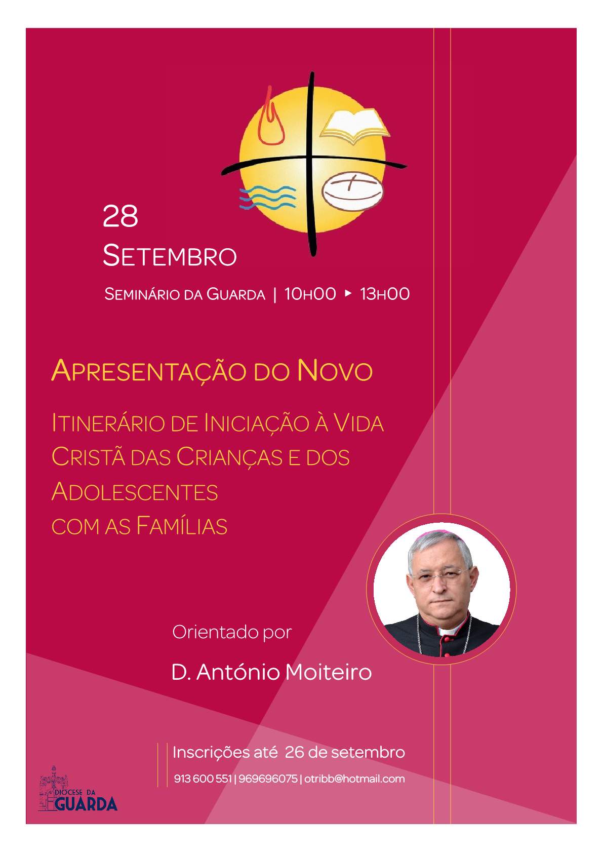 No próximo dia 28 de setembro realizar-se-á no Seminário Maior da Guarda a Apresentação do Novo Itinerário de Iniciação à Vida Cristã das crianças e dos adolescentes com as famílias. O encontro terá início pelas 10h00, estendendo-se até às 13h00 e será orientado por D. António Moiteiro, Bispo de Aveiro.
