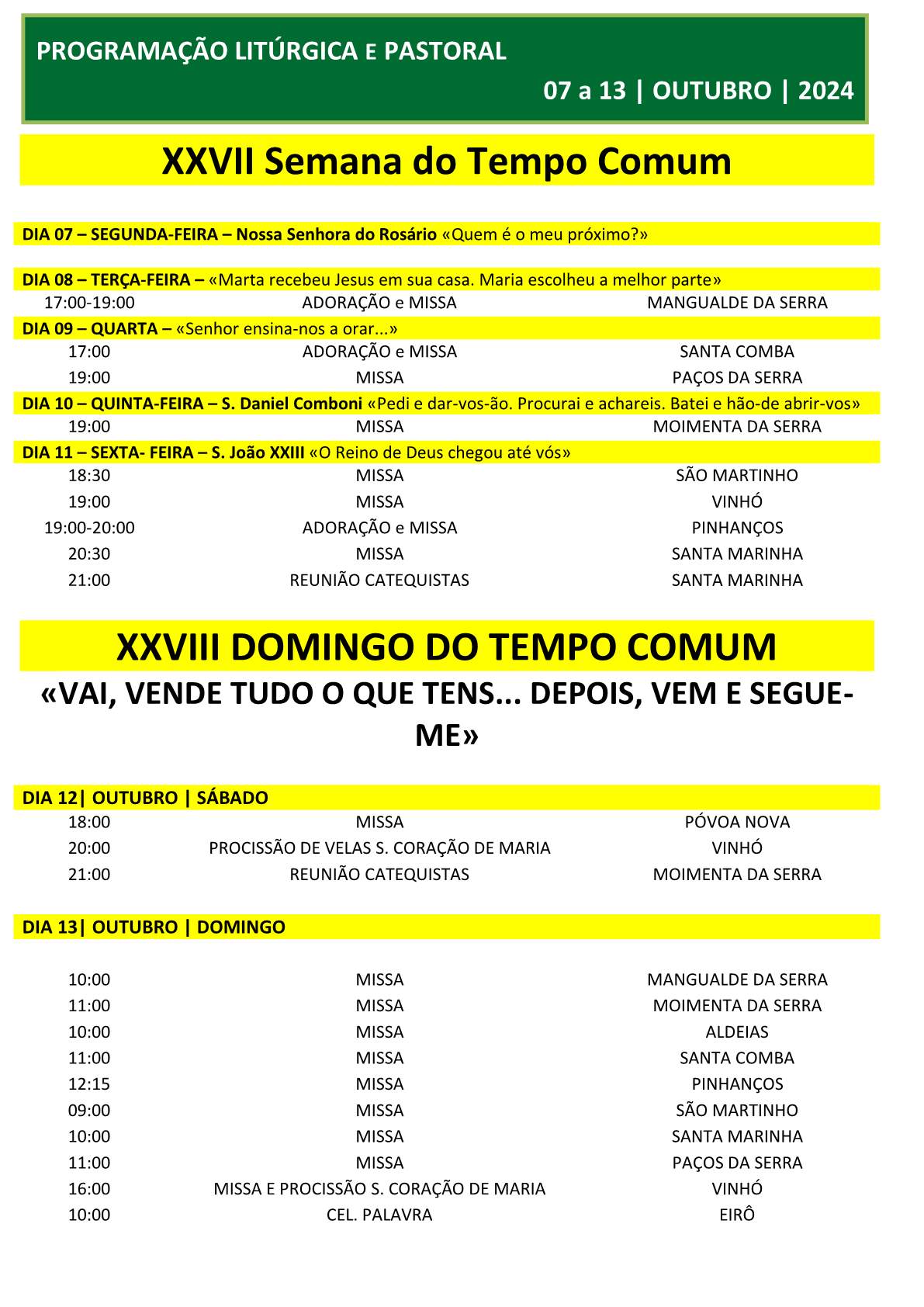 Agenda 07 a 13 | Outubro 2024 Detalhes Categoria: Agenda Publicado em segunda, 07 outubro 2024 21:45 Escrito por Paróquia de Santa Marinha Visualizações: 258 Anterior Seguinte